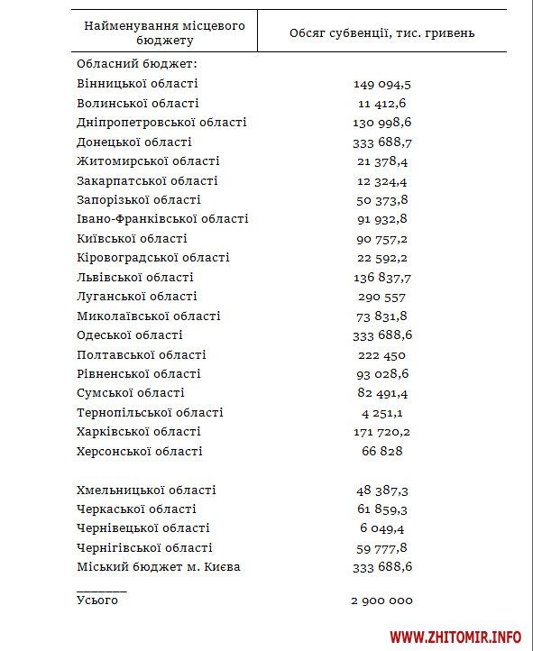 У 2015 році уряд виділив місцевим бюджетам 2 млрд 900 млн грн на погашення заборгованості різниці в тарифах за тепло- та водопостачання, яка виникла у зв’язку з невідповідністю фактичної вартості послуг тарифам. Для Житомирської області на погашення такої заборгованості Кабміном передбачена субвенція у розмірі 21 млн 378,4 тис. грн.