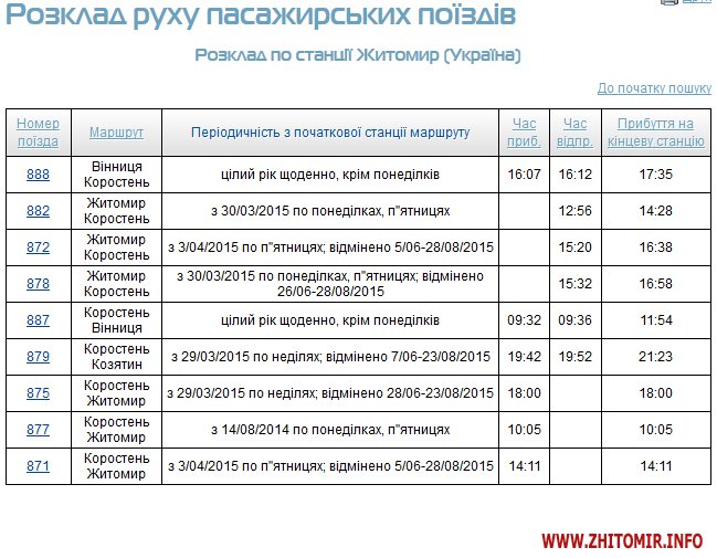 На сайте «Укрзалізниці» опубликовано расписание движения поездов по станции Житомир: железнодорожное сообщение есть только с одним областным центром (Винница).