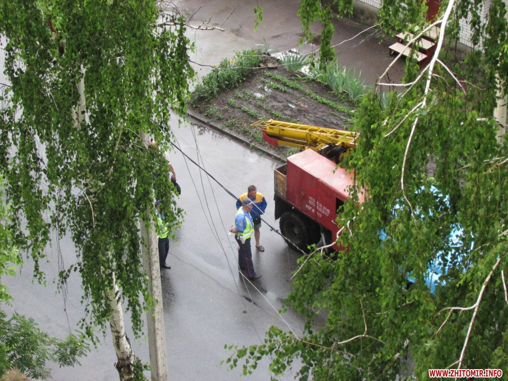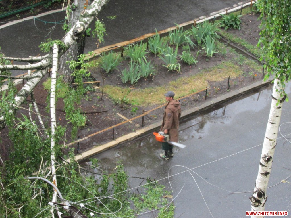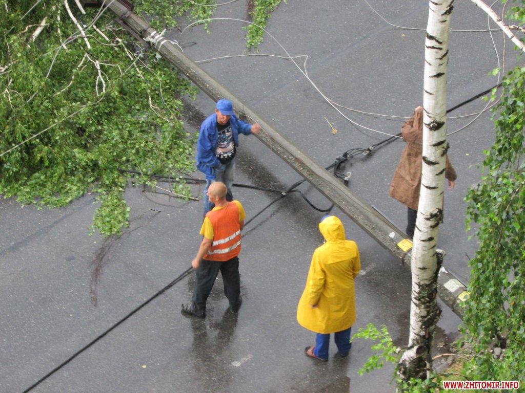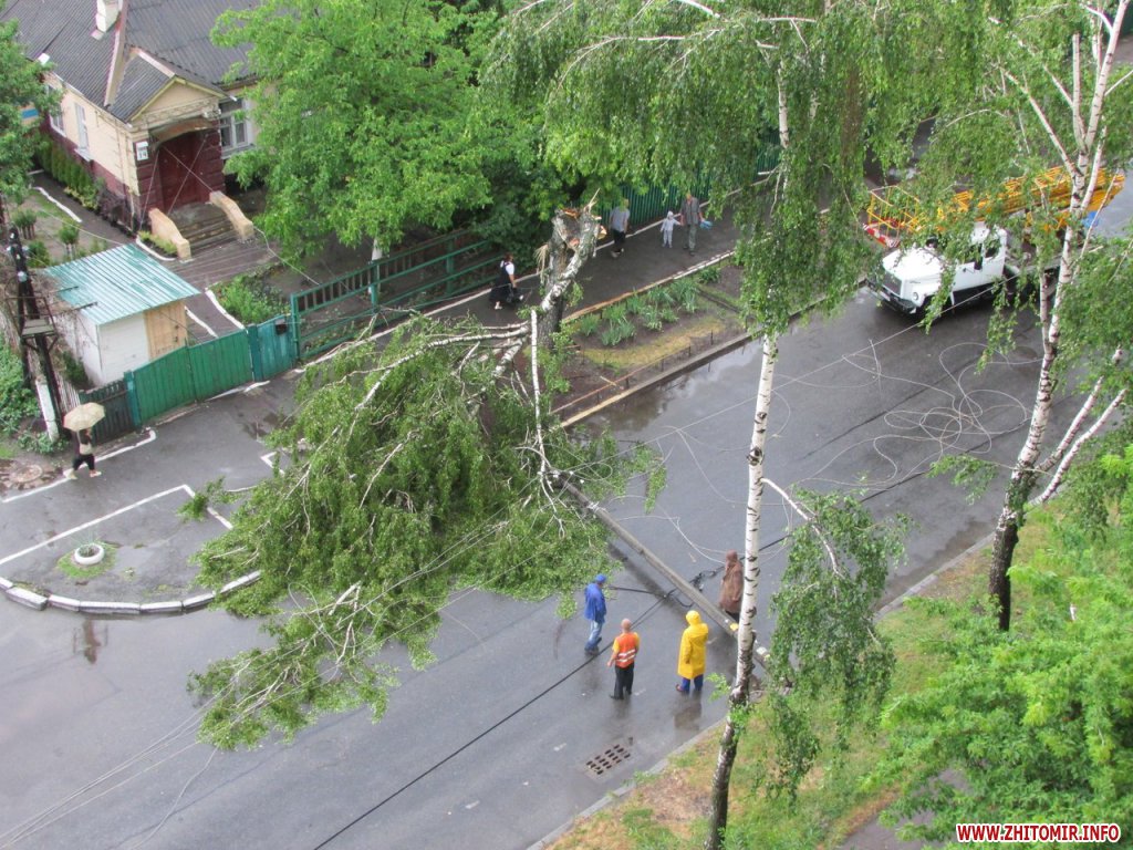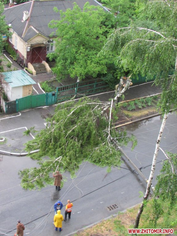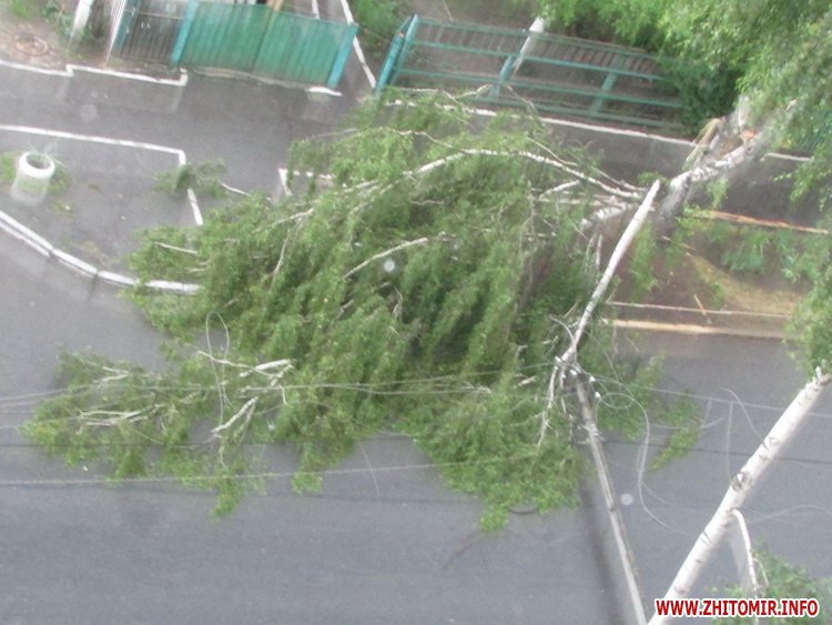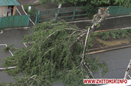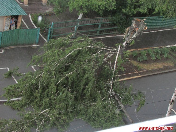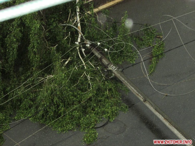 15 июня во время ливня в Житомире, недалеко от Житнего рынка, по улице Гоголевской упала береза. При падении дерево зацепилось за провода и повалило на проезжую часть электроопору.
