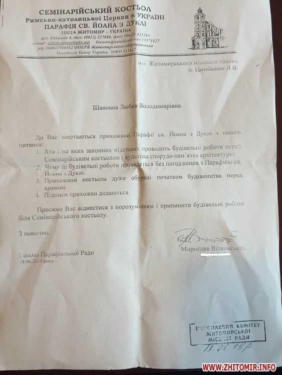 У зверненні до в.о. мера Житомира Любові Цимбалюк прихожани просять пояснити, що саме будується перед культовою спорудою – пам’яткою архітектури. Люди обурені початком будівництва перед храмом та просять припинити будівельні роботи біля костьолу.