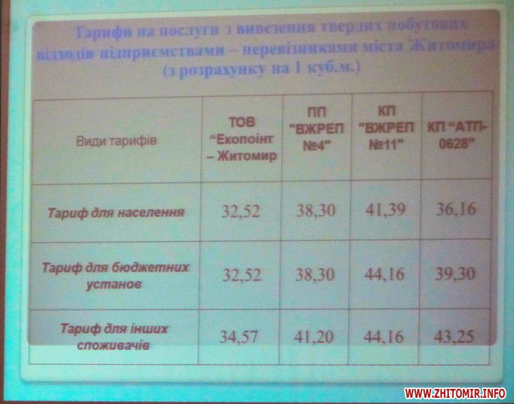 «Розглянувши звернення ТОВ «Зелене Місто-Житомир», ПП «Керуюча компанія «Чисте місто», ПП «КВЖРЕП №8» про встановлення тарифів на послуги з вивезення твердих побутових відходів, враховуючи відмову ДП «Фірма Альтфатер-Київ» від укладення договорів про надання послуг з вивезення побутових відходів за результатами проведеного 08-10.06.2015 конкурсу на право надання таких послуг на певній території м. Житомира, межі якої були передбачені умовами конкурсу по лотах №№1, 2 та 3, виконавчий комітет вирішив встановити тимчасово – до 1 вересня 2015 року тарифи на послуги з вивезення твердих побутових відходів», - йдеться у проекті рішення, в якому зазначені конкретні розміри тарифів, які планується затвердити, а саме: