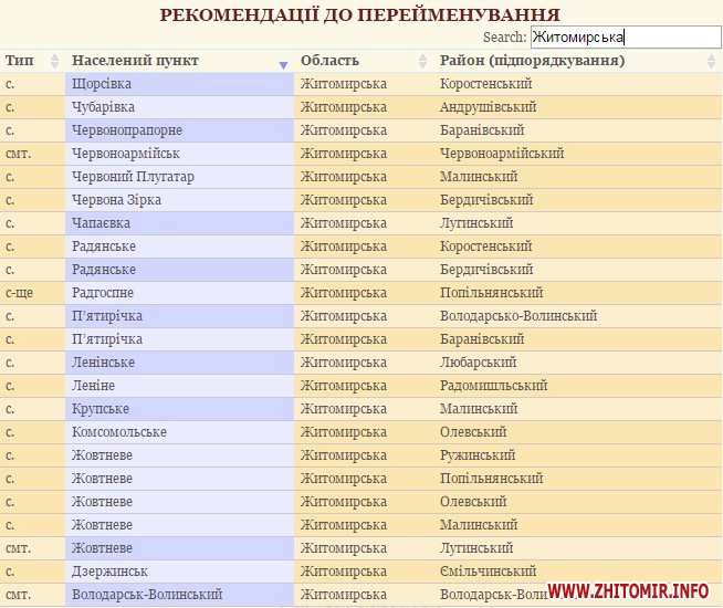 У Житомирській області перейменують 3 смт і 20 сіл, що підпадають під дію Закону про декомунізацію.