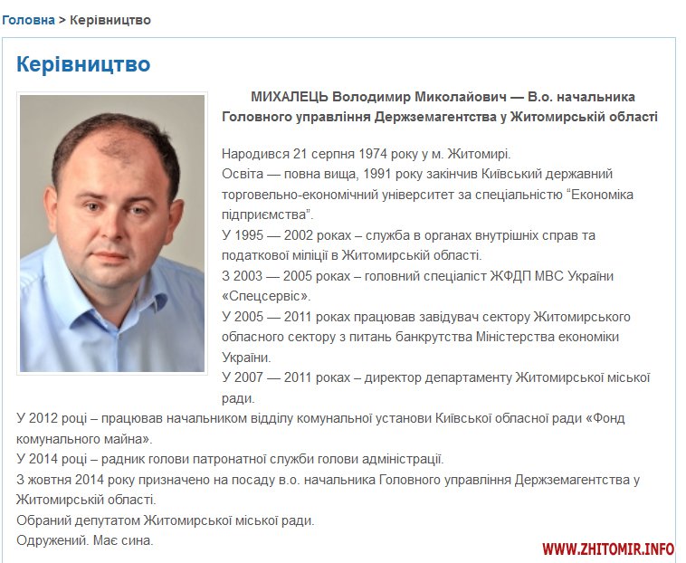 На сайте областного земельного управления по состоянию на 8 июля указано, что Михалец Владимир Николаевич - и.о. начальника главного управления Госземагентства в Житомирской области.