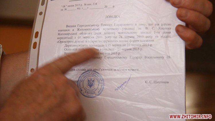 Телефон Едуарда Городинського не замовкає – друзі і рідня постійно запитують про сина, якого 10 днів тому призвали на строкову службу. Отримавши повістку, 20-річний Томаш був студентом Житомирського музичного училища, це підтверджують документи. Крім того, хлопець вже був зарахований до Вищої духовної семінарії Босих Кармелітів у польському Кракові, а ще має травму хребта. Втім, у військкоматі студенту відстрочку не надали і у день випуску відправили у Полтаву, навіть не давши змоги отримати диплом.
