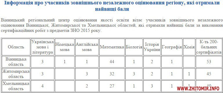 «Особливе вітання учасникам зовнішнього незалежного оцінювання, які отримали 200 балів із двох предметів ЗНО, з Житомирської області це: Мартинів Дмитро Васильович, випускник Романівської гімназії (Житомирська область), отримав максимальну кількість балів за виконання сертифікаційних робіт з математики та географії; Шумляківська Мар’яна Володимирівна,випускниця Житомирського міського ліцею при Житомирському державному технологічному університеті, отримала максимальну кількість балів за виконання сертифікаційних робіт з біології та хімії», – йдеться у повідомленні.