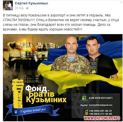 Как сообщал Житомир.info, неделю назад Фонд Братьев Кузьминых бросил клич помощи раненному бойцу, на лечение которого недоставало около 50 тыс. долларов.