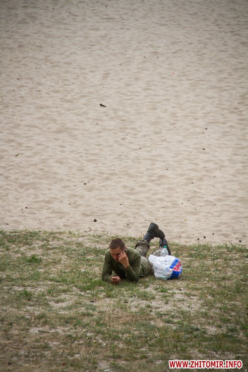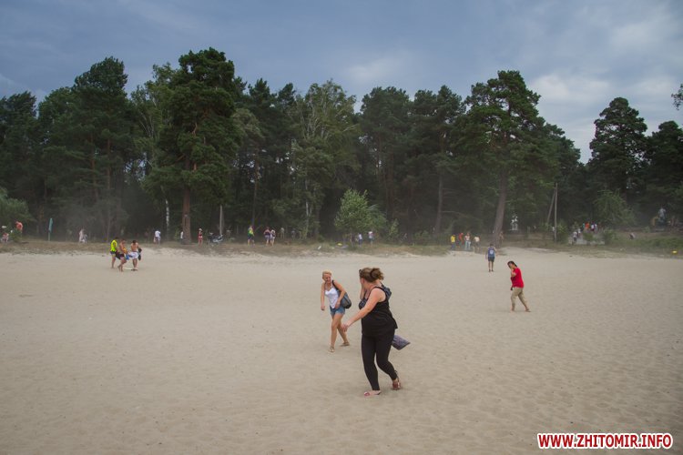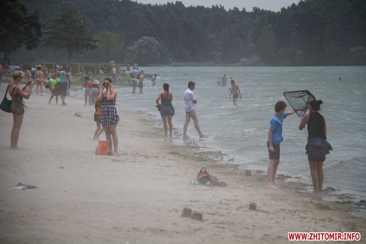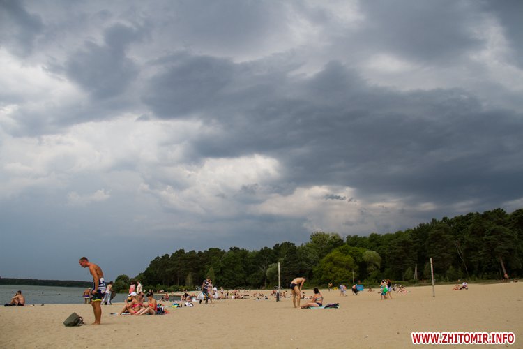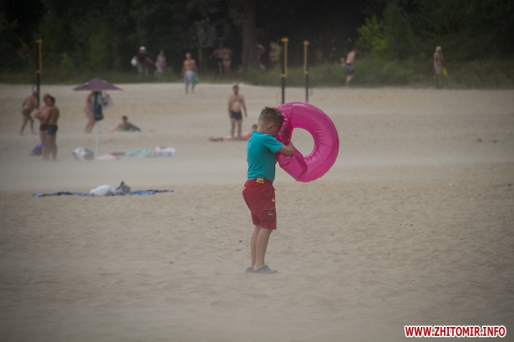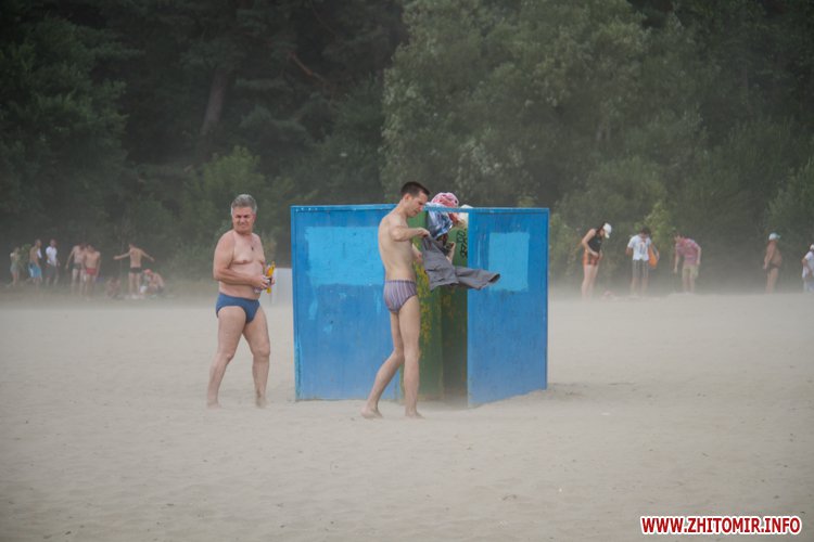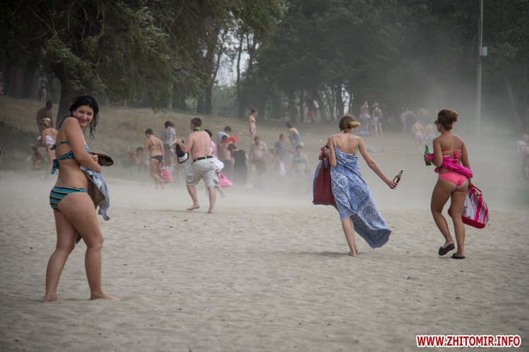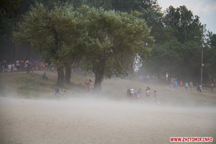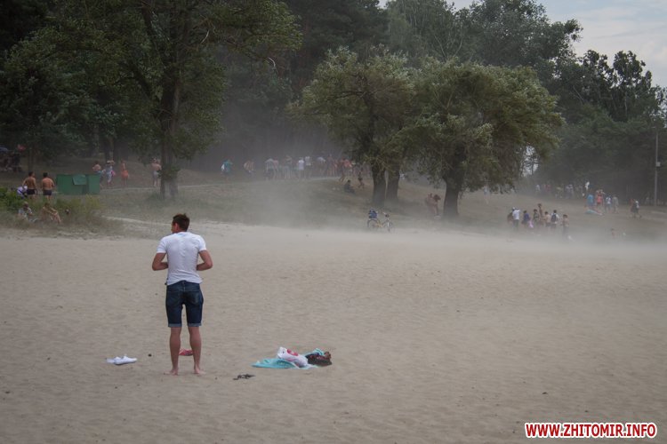 Как известно, 26 июля в Житомире была пиковая жара - до 40 градусов. Около 16.30 небо над Тетеревом затянули тучи и началась мини-песчаная буря, гонящая людей прочь. Порывы ветра поднимали песок на пляже. Купающиеся в панике выходили на берег, окликали детей, подбирали вещи и шли в сторону въезда в гидропарк.
