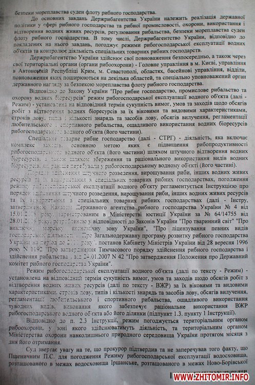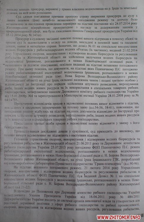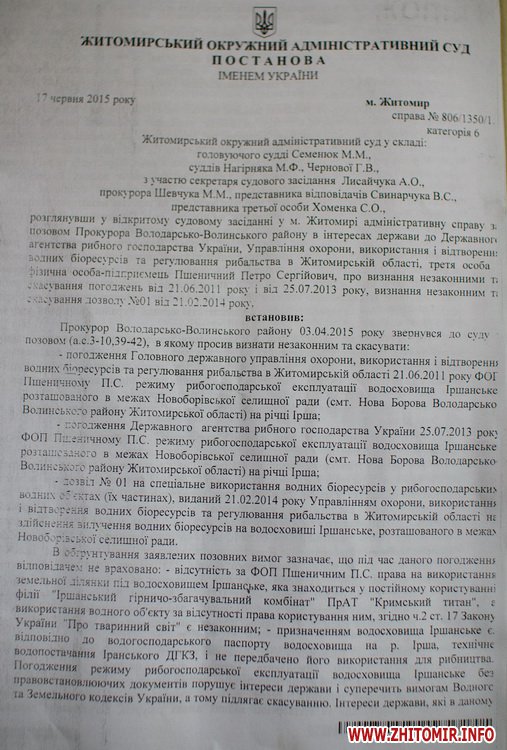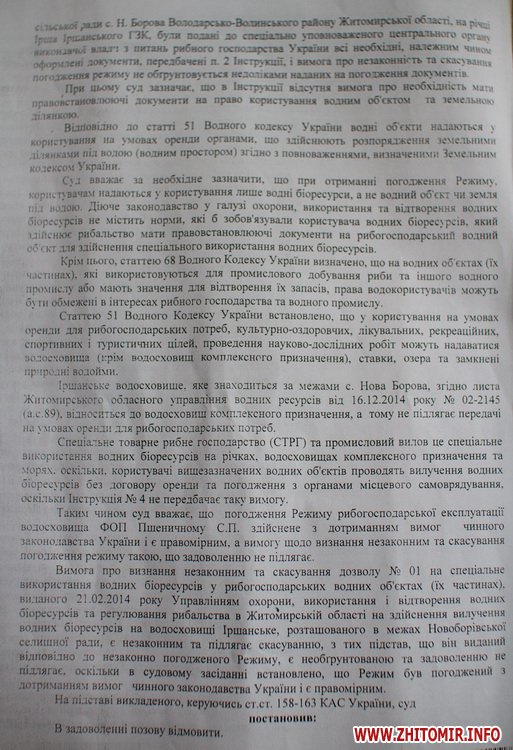 Тож звинувачення екологічної інспекції щодо незаконного здійснення промислового вилову риби на водосховищах підприємець вважає безпідставними. На підтвердження цього він надав Житомир.info копію постанови Житомирського окружного адміністративного суду від 17 червня 2015 року, якою суд відмовив у задоволенні позову прокуратури щодо визнання незаконними та скасування погоджених рибоохороною режимів та виданого дозволу ФОП Пшеничний П.С.