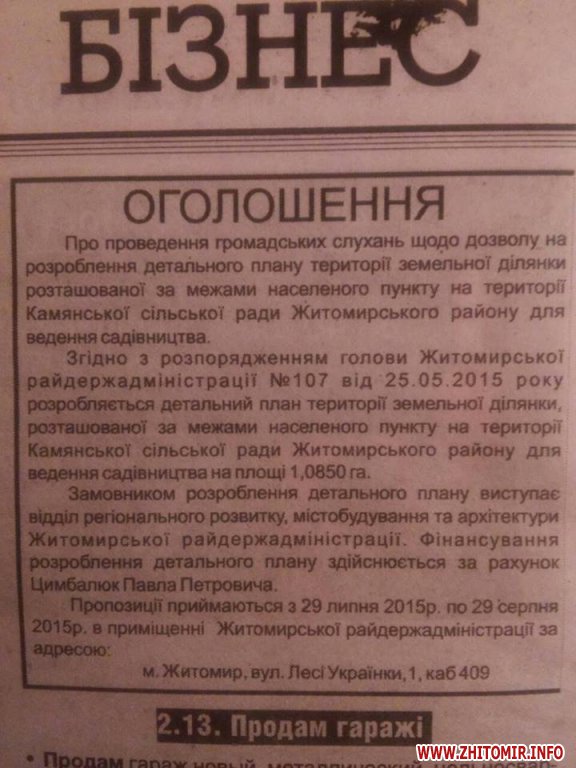 «Согласно распоряжения председателя Житомирской райгосадминистрации №107 от 25.05.2015 года разрабатывается детальный план территории земельного участка, расположенного за пределами населенного пункта на территории Каменского сельского совета Житомирского района для ведения садоводства на площади 1,0850 га. Заказчиком разработки детального плана выступает отдел регионального развития, градостроения и архитектуры Житомирской райгосадминистрации. Финансирование разработки детального плана осуществляется за счет Цимбалюк Павла Петровича», - говорится в объявлении.