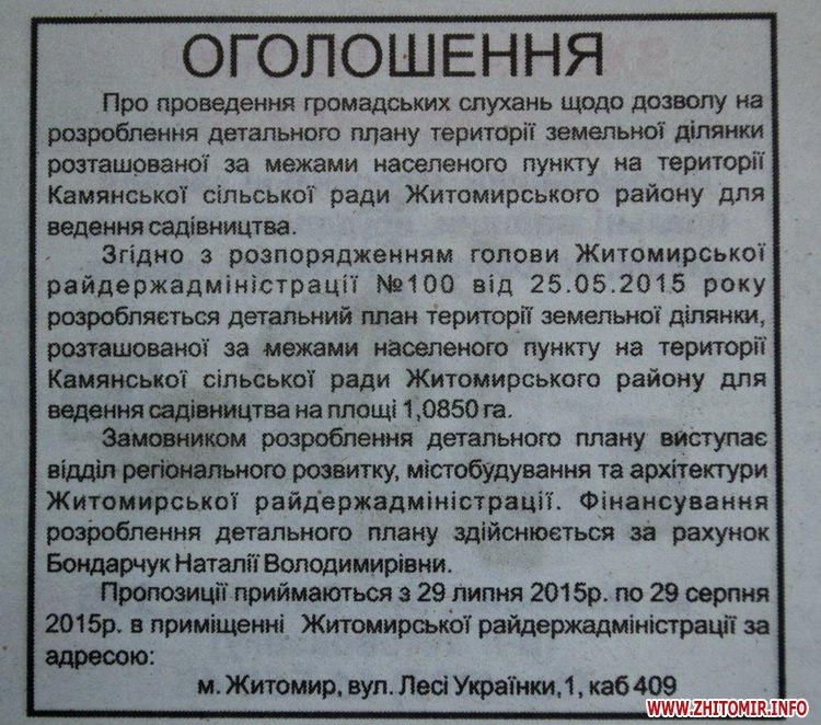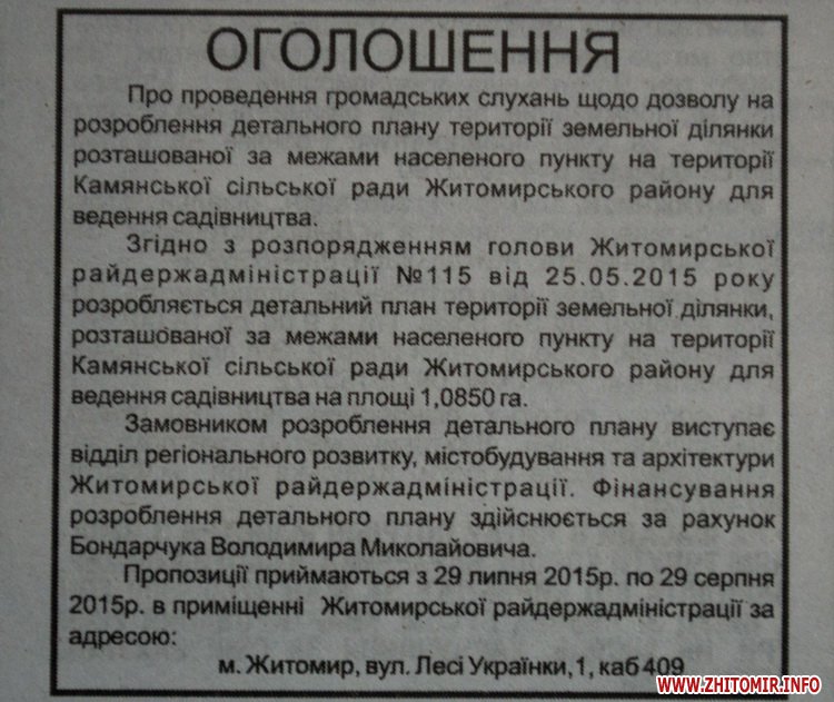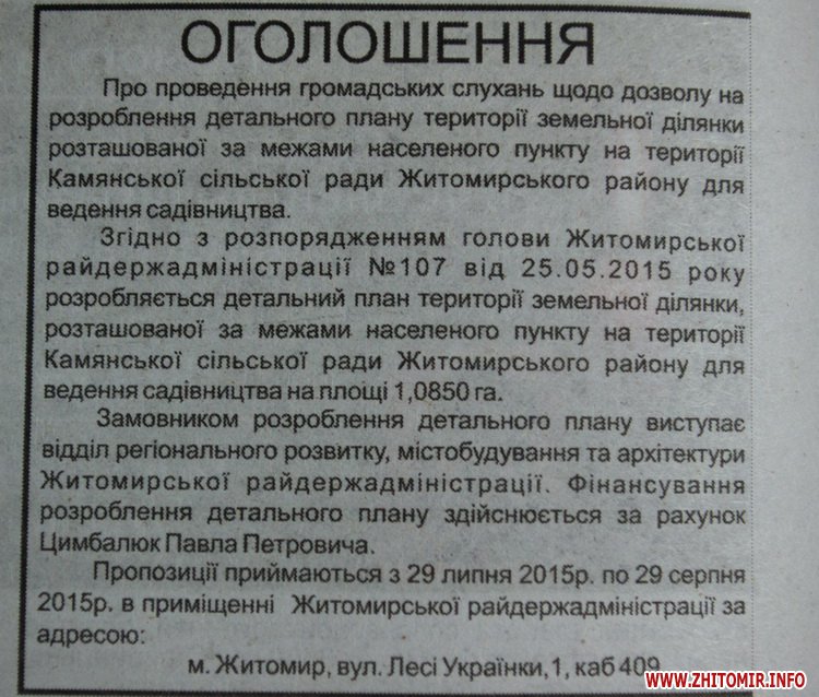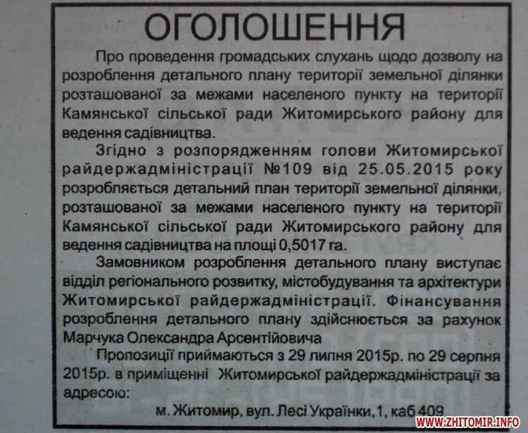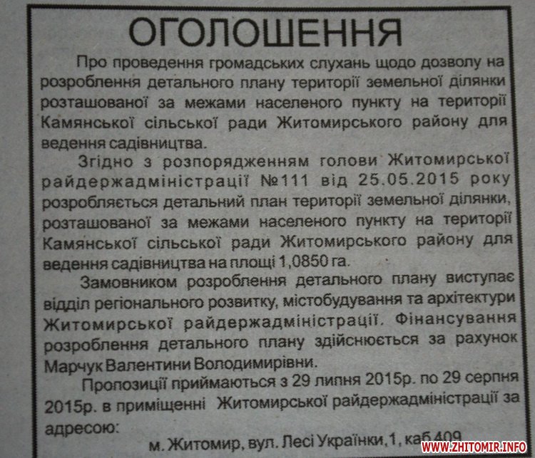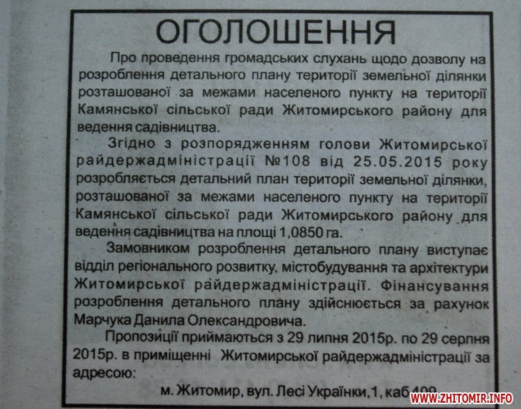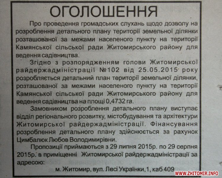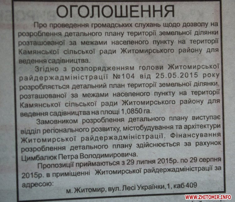 «Согласно распоряжения председателя Житомирской райгосадминистрации №102 от 25.05.2015 года разрабатывается детальный план территории земельного участка, расположенного за пределами населенного пункта на территории Каменского сельского совета Житомирского района для ведения садоводства на площади 0,4732 га. Заказчиком разработки детального плана выступает отдел регионального развития, градостроения и архитектуры Житомирской райгосадминистрации. Финансирование разработки детального плана осуществляется за счет Цимбалюк Любови Владимировны», - говорится в объявлении.
