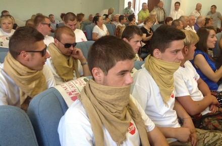 В зале присутствуют представители Радикальной партии Олега Ляшко, люди в футболках «Коррупция…STOP!», есть парни в военной форме с нашивками батальона «Айдар».