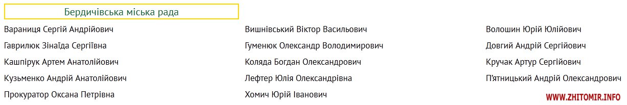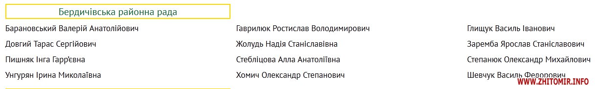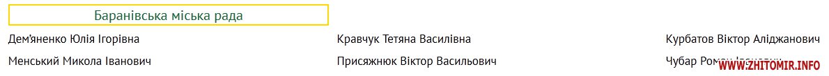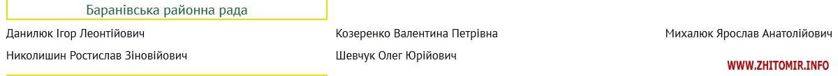 Кандидатів до Баранівської райради – 5, Баранівської міської ради – 6, Бердичівської райради – 12, Бердичівської міської ради – 14, Олевської райради – 5, Олевської міської ради – 2.