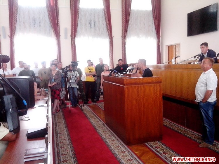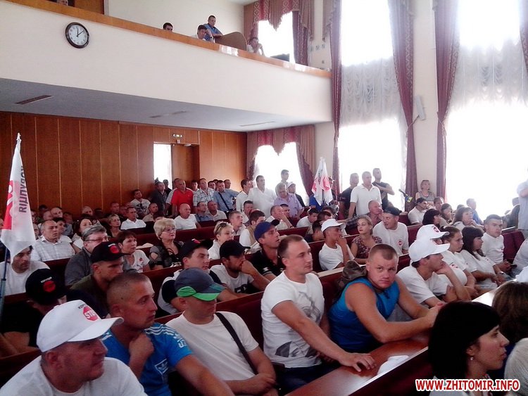 Активисты блокируют выступление кандидата на должность начальника Главного управления Госгеокадастра в Житомирской области Максима Глушаницы.
