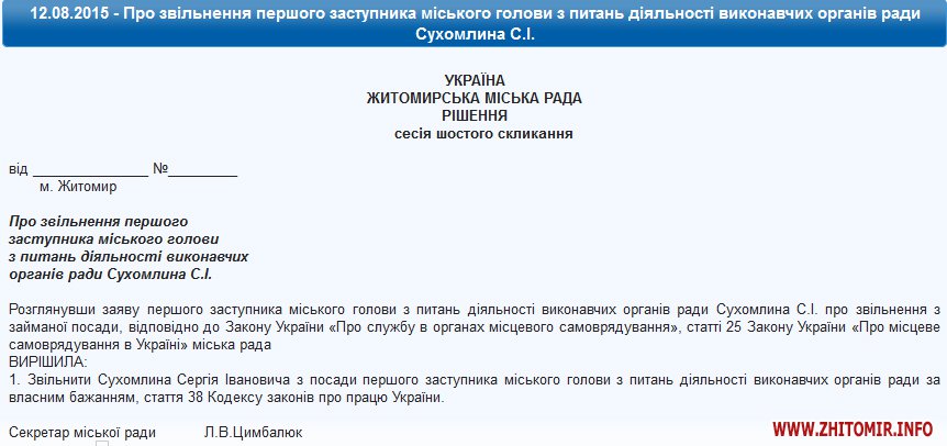 «Рассмотрев заявление первого заместителя городского главы по вопросам деятельности исполнительных органов совета Сухомлина С.И. об увольнении с занимаемой должности в соответствии с Законом Украины «О службе в органах местного самоуправления», статьи 25 Закона Украины «О местном самоуправлении в Украине» городской совет решил: уволить Сухомлина Сергея Ивановича с должности первого заместителя городского главы по вопросам деятельности исполнительных органов совета по собственному желанию, статья 38 Кодекса законов о труде Украины», - говорится в проекте.