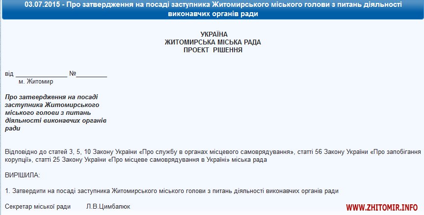 На сайте Житомирского горсовета появился проект решения об увольнении первого заместителя мэра Сергея Сухомлина.