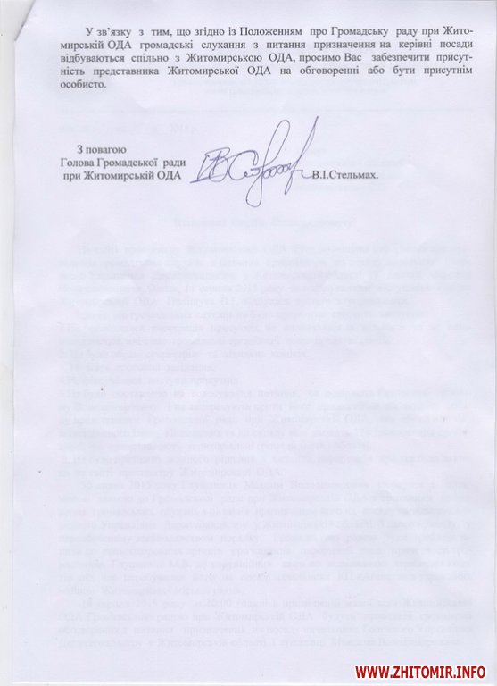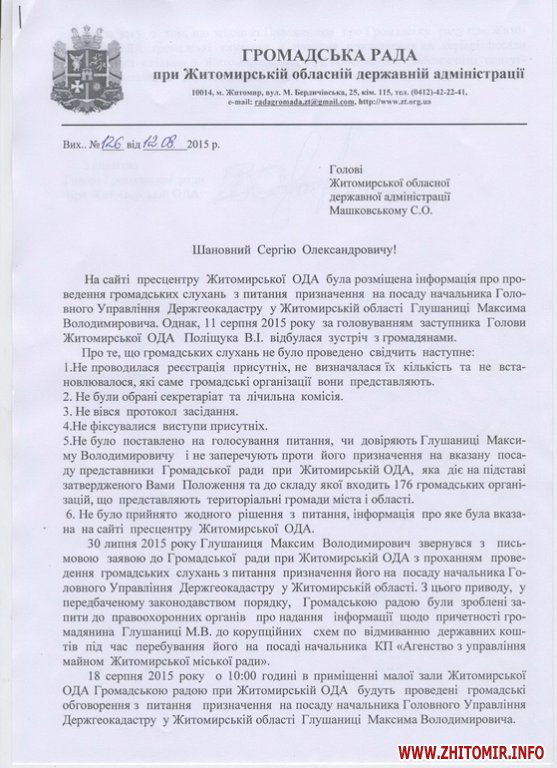 «12 серпня 2015 року відбулась позачергова нарада голови громадської ради при Житомирської ОДА та його заступників, де були присутні і інші членів громадської ради, з приводу участі громадськості в обговореннях кандидатів на керівні посади в області. В результаті обміну думками підготовлено лист голові Житомирської обласної державної адміністрації, в якому голова громадської ради Володимир Стельмах висловив позицію щодо участі громадської ради в таких обговореннях, зокрема запропонував провести 18 серпня 2015 року о 10 годині громадські обговорення з питання призначення на посаду начальника Головного управління Держгеокадастру у Житомирській області Глушаниці Максима Володимировича», - повідомляє прес-служба Громадської ради.