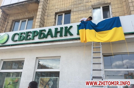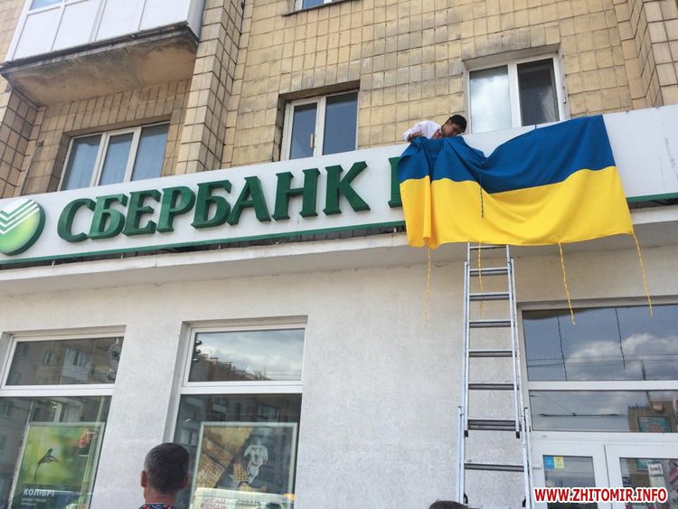 Під час акції на вивіски відділень установи «Сбербанк Росії», які знаходяться на майдані Соборному та вулиці Східній, активісти повісили прапори України, сховавши під ними назву країни агресора.