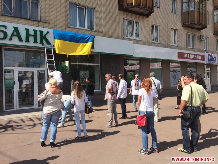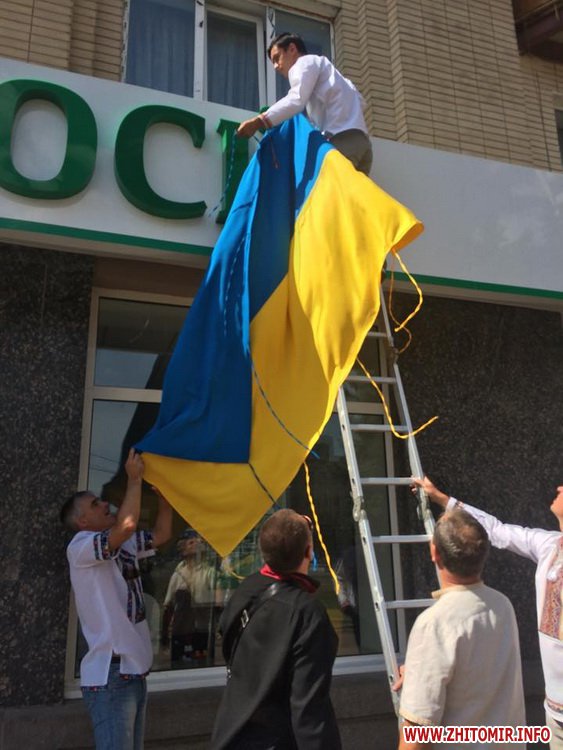 23 серпня в День Державного прапора України Житомирська міська організація ВО «Свобода» подарувала банкам окупанта державні прапори.