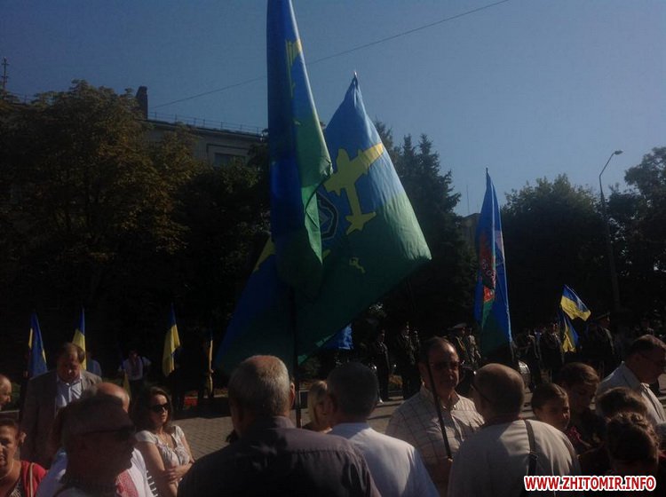 Біля пам’ятника зібралися кількасот людей з державними прапорами та прапорами 95-ї бригади.