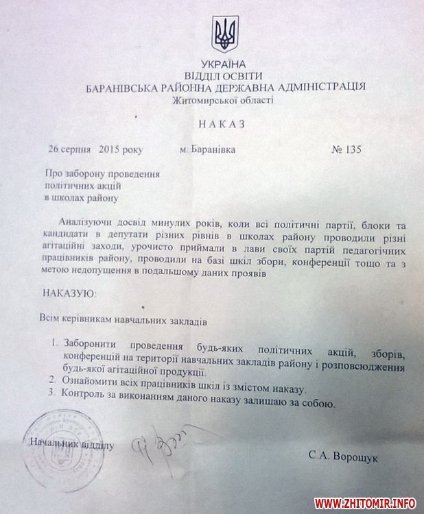 У Житомирській області відділ освіти Баранівської райдержадміністрації заборонив усім керівникам шкіл району проводити на території навчальних закладів будь-які політичні акції та розповсюджувати агітаційну продукцію.