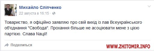 «Товариство, я офіційно заявляю про свій вихід із лав Всеукраїнського об'єднання "Свобода". Прохання більше не асоціювати мене з цією партією», - пише Михайло Сліпченко.