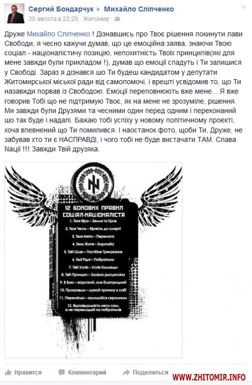 «Я вже говорив Тобі що не підтримую Твоє, як на мене не зрозуміле, рішення. Ми завжди були Друзями та чесними один перед одним і переконаний шо так буде і надалі. Бажаю тобі успіху у новому політичному проекті, хоча впевнений що Ти помилився», - написав 30 серпня Бондарчук, який вже наступного дня був серед «свободівців», які пікетували Верховну Раду.