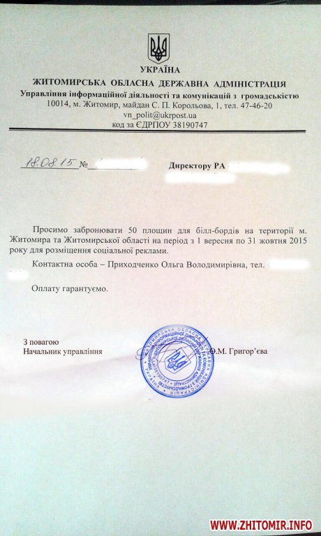 «Просим забронировать 50 площадей для билл-бордов на территории г.Житомира и Житомирской области на период с 1 сентября по 31 октября 2015 года для размещения социальной рекламы. Оплату гарантируем», - говорится в письме.