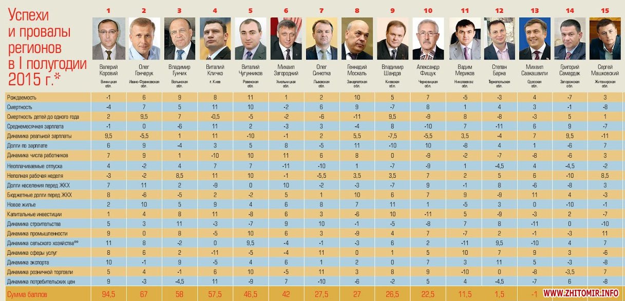 «По итогам полугодия Житомирская область имела наилучшие темпы прироста промышленной продукции – на 10% по сравнению с январем-июнем прошлого года (правда, по итогам семи месяцев первенство вернула себе Виннитчина – 15,3% против 12,3% на Житомирщине). Высокие показатели промышленного роста область демонстрирует с 2011 г. за счет очень динамичного развития добывающей промышленности (предприятия НАК «Надра Украины» и частные компании на тысячах гектаров разрабатывают месторождения минеральных ресурсов, таких как ильмениты, кварциты, граниты, лабрадориты). К сожалению, этот бум слабо сказывается на реальных зарплатах: за шесть месяцев на Житомирщине они сократились больше всего – на 26,6% по сравнению с аналогичным периодом 2014 г., а по размеру среднемесячной зарплаты область в пятерке аутсайдеров (2985 грн.). В числе других провалов можно назвать предпоследнее место по динамике строительства и попадание в четверку наихудших по динамике экспорта и потребительских цен, а также по смертности населения и в пятерку отстающих по объему освоенных капитальных инвестиций в пересчете на одного жителя. С другой стороны, область заняла третье-четвертое места среди регионов с наименьшей долей работников, переведенных на неполную рабочую неделю, стала пятой по динамике сельского хозяйства и розничной торговли, а также среди тех, кто имеет наименьшую задолженность по зарплате на одного работника. Общий итог губернатора Сергея Машковского: -20,5 балла», - пишет издание.