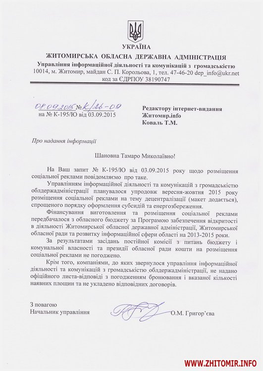 Как сообщал Житомир.info, в августе управление информационной деятельности и коммуникаций с общественностью Житомирской ОГА обратилось в рекламные агентства с просьбой забронировать с 1 сентября по 31 октября 2015 года билборды в Житомире и области для размещения социальной рекламы. В письме, подписанном начальником управления Ольгой Григорьевой, оплату гарантировали.