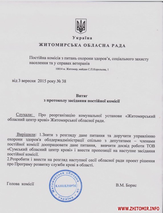 У зв’язку з цим два проекти рішень обласної ради щодо реорганізації комунальної установи, які мали розглядатися на сесії 10 вересня, зняті з розгляду. Однак, розуміючи, що проблема залишається відкритою, постійна комісія обласної ради з питань охорони здоров’я, соціального захисту населення та у справах ветеранів дала доручення управлінню охорони здоров’я ОДА: разом із депутатами обласної ради вивчити досвід роботи Сумського обласного центру крові, внести пропозиції на наступне засідання постійної комісії, розробити проект рішення про Програму розвитку служби крові в області.