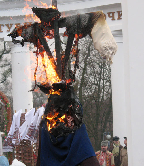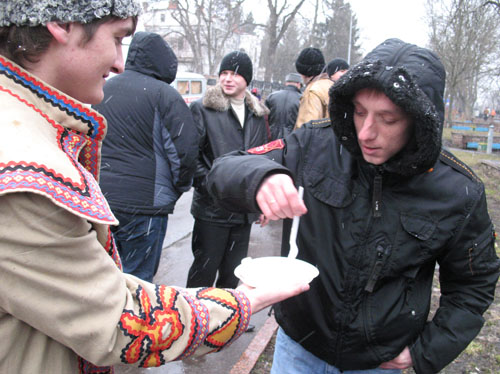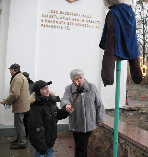 Несмотря на холодную погоду: шквальный ветер, снег с дождем и вообще неприятную атмосферу на улице многие из житомирян решили все-таки отпраздновать масленицу, как полагается: полакомиться варениками и блинами, ну и, естественно, сжечь чучело зимы. Кроме того, жители города имели возможность посмотреть праздничное представление и поучаствовать в различных конкурсах.