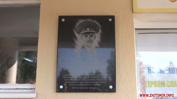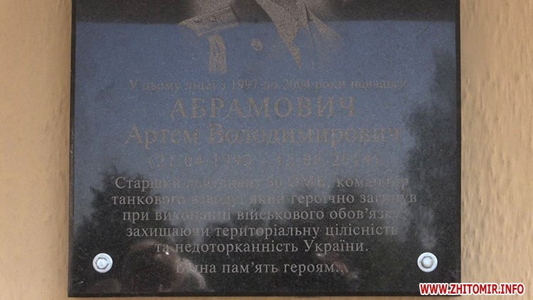 Мемориальную доску погибшему офицеру Артему Абрамовичу установили на фасаде здания Житомирского экологического лицея №24 в Житомире. Почтить память старшего лейтенанта 30-й Новоград-Волынской механизированной бригады вышли около тысячи учеников и учителей лицея. Также приехали родные и сослуживци бойца.