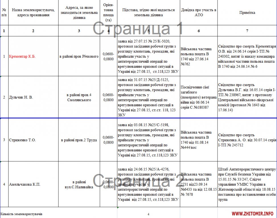Не виділятимуть землю і військовослужбовцям – учасникам АТО, який у відповідному додатку 1032. Перше клопотання було від Ващенка І.П. – 7 липня 2014 року, довідку про участь в АТО він отримав 16.06.2014р. у військовій частині польова пошта В 1740. Останнім у списку зазначений Піменов В.М., який подав клопотання 3 вересня 2015 року і має посвідчення учасника бойових дій від 24.06.2015р.