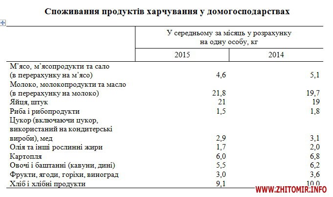 За перший квартал 2015 року у порівнянні з цим же періодом минулого року відзначається зменшення кількості спожитих продуктів харчування по 8 з 10 основних груп.