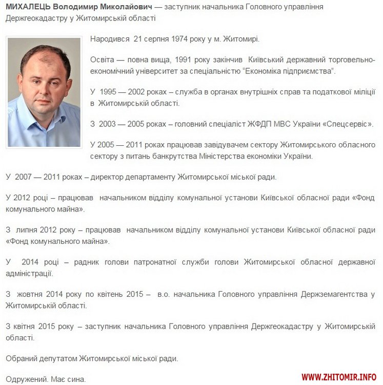 Як повідомляв Житомир.info, керівник головного управління Держземагентства в області, депутат міськради Володимир Михалець був затриманий в Житомирі 11 червня. Його звинуватили в отриманні хабара в розмірі 10 тис. доларів. За інформацією МВС, він «організував злочинну схему вимагання та отримання неправомірної вигоди за вирішення питань у сфері земельних відносин».
