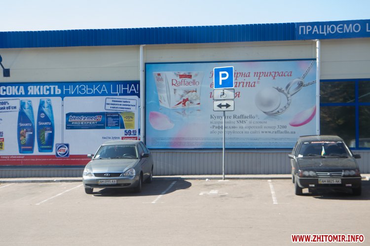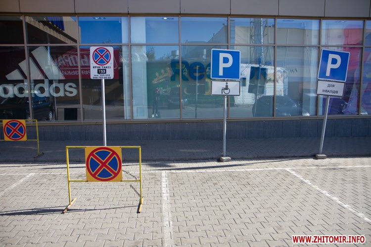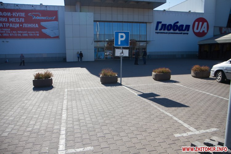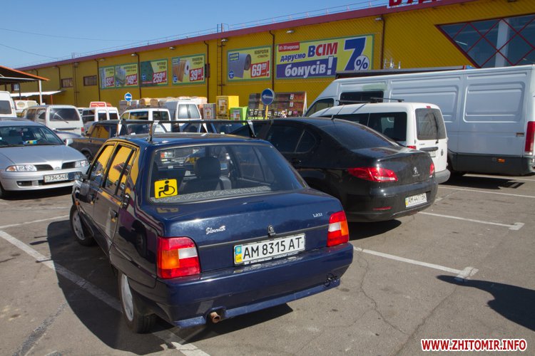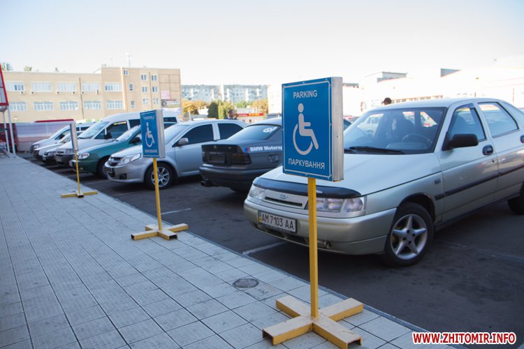 У Житомирі на парковках біля торгових центрів, лікарень, авто та залізничного вокзалу розміщені місця для паркування автомобілів людей з інвалідністю, які позначені спеціальною розміткою і знаком.