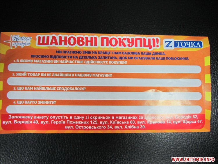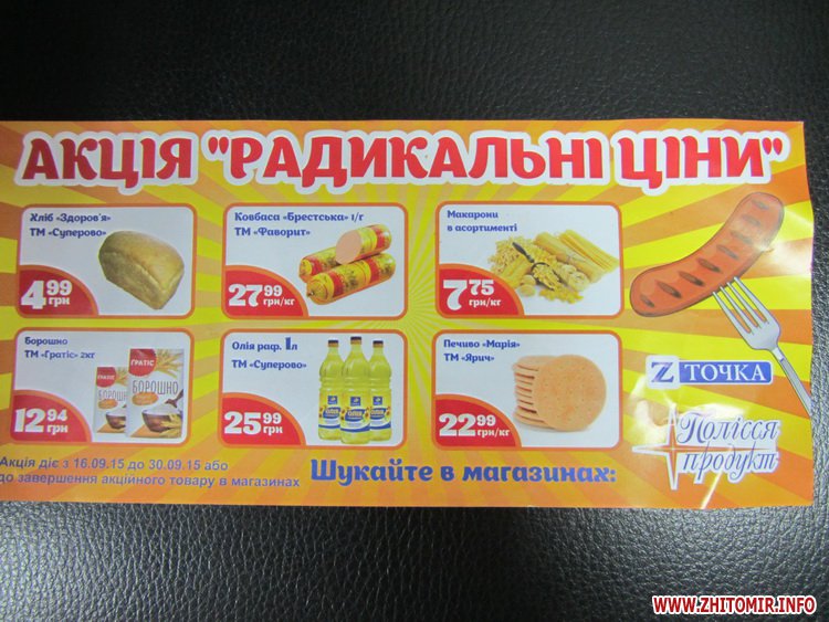 У магазині «Полісся - Продукт» розповсюджують листівки про акцію «Радикальні ціни». Генеральним директором ТОВ ТК «Полісся-Продукт» є Олександ Ракович, перший номер в списку кандидатів в депутати до Житомирської міської ради від Радикальної партії Олега Ляшка.