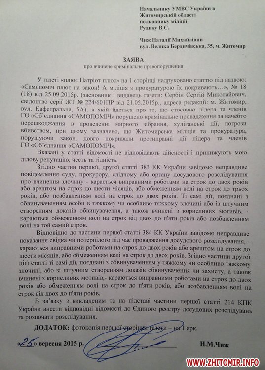 У газеті «плюс Патріот плюс» на 1 сторінці надруковано статтю під назвою: «Самопоміч плює на закон! А міліція з прокуратурою їх покривають…», № 18 (18) від 25.09.2015р. (засновник і видавець газети: Сербін Сергій Миколайович, свідоцтво серії ЖТ № 224/601ПР від 21.05.2015р., адреса редакції: м. Житомир, вул. Кафедральна, 5А), в якій йдеться про те, що стосовно лідера та членів ГО «Об’єднання «САМОПОМІЧ» порушено кримінальне провадження за начебто перешкоджання в проведенні мирного зібрання, хуліганські дії, погрози вбивством, при цьому зазначено, що Житомирська міліція та прокуратура, порушуючи закон, довго покривали протиправні дії лідера та членів ГО «Об’єднання «САМОПОМІЧ».