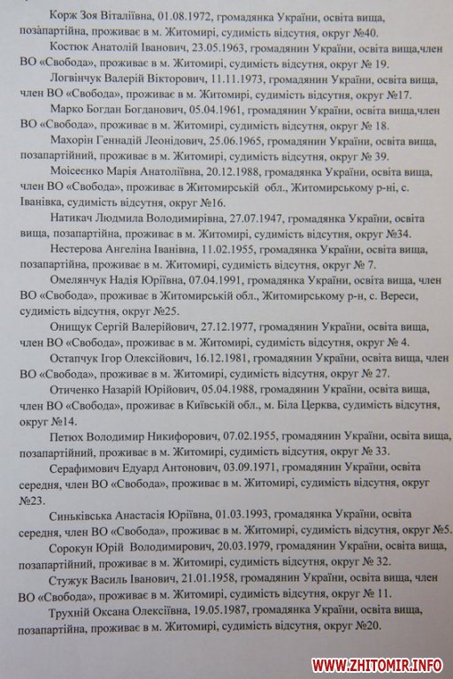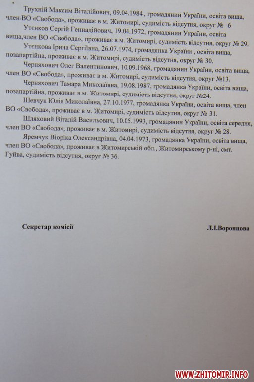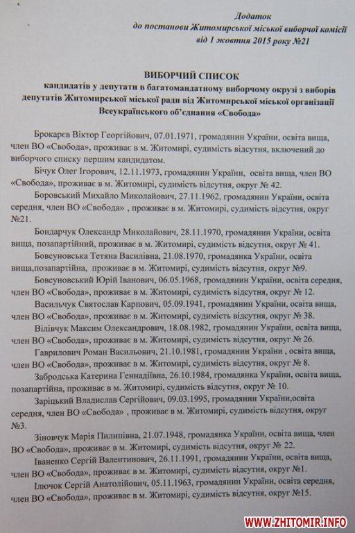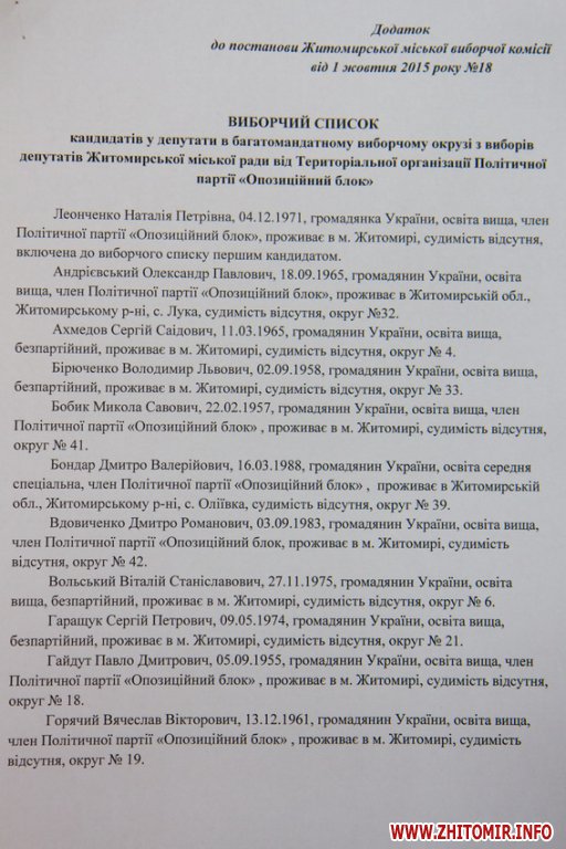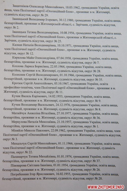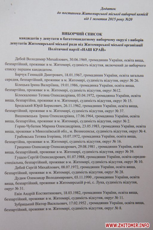 Житомирская городская избирательная комиссия зарегистрировала 16 кандидатов в мэры и списки кандидатов в депутаты горсовета от 19 партий.