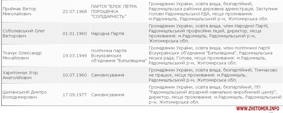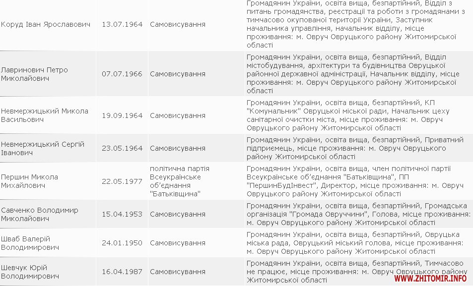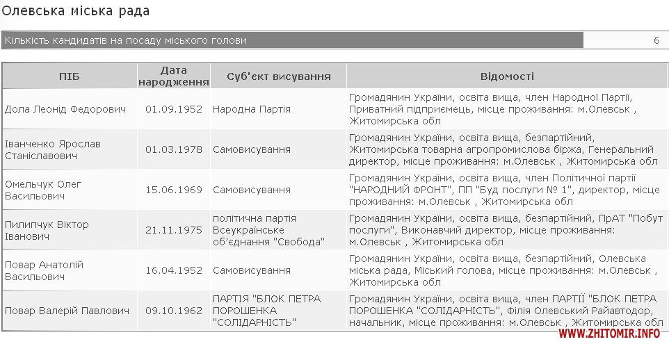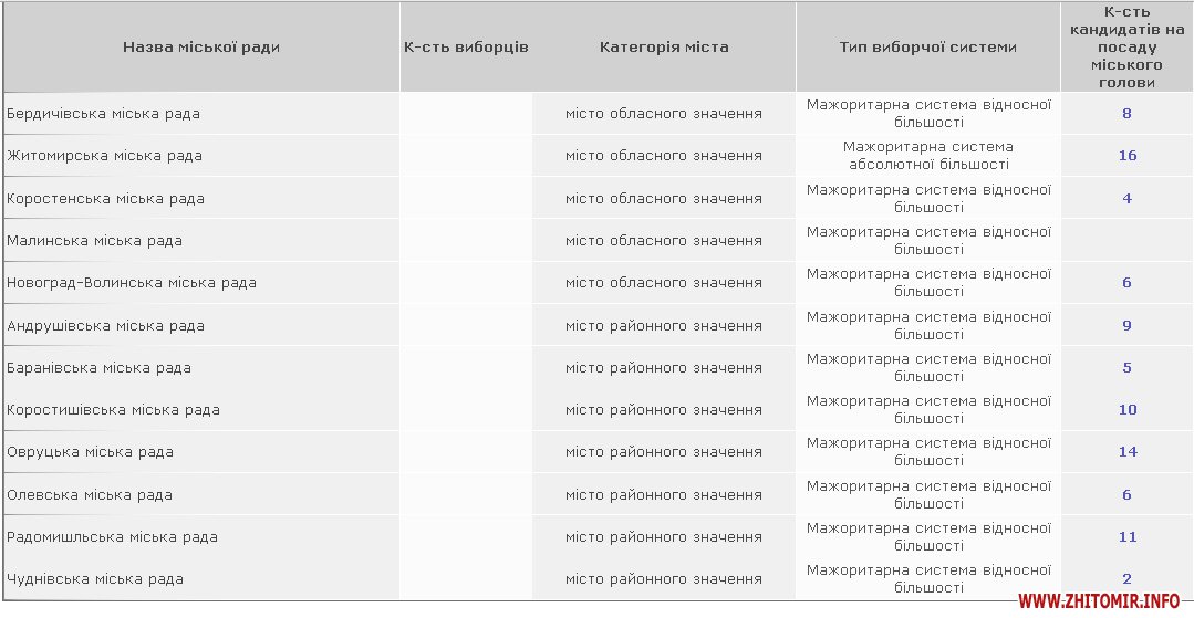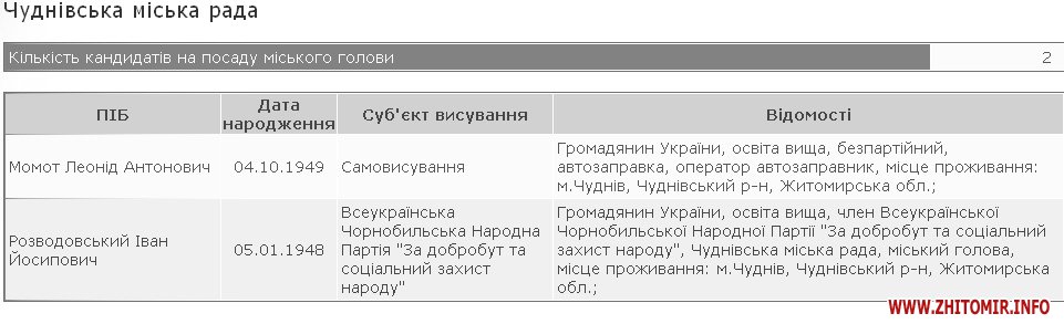 Мером Житомира хочуть стати 16 осіб, в Овручі бажаючих – 14. Найменше претендентів на крісло мера Чуднова – лише один самовисуванець виявив бажання позмагатися з діючим мером Іваном Розводовським, який є рідним братом нардепа Віктора Развадовського.