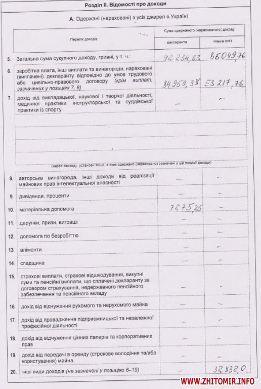 Доход заместителя директора департамента в прошлом году составил 71 тыс. 140 грн, из которых: зарплата – 68 тыс. 687 грн, материальная помощь – 2 тыс. 453 грн. Доходы членов семьи (жена, дочь и сын) составили 23 тыс. 932 грн – зарплата.