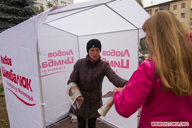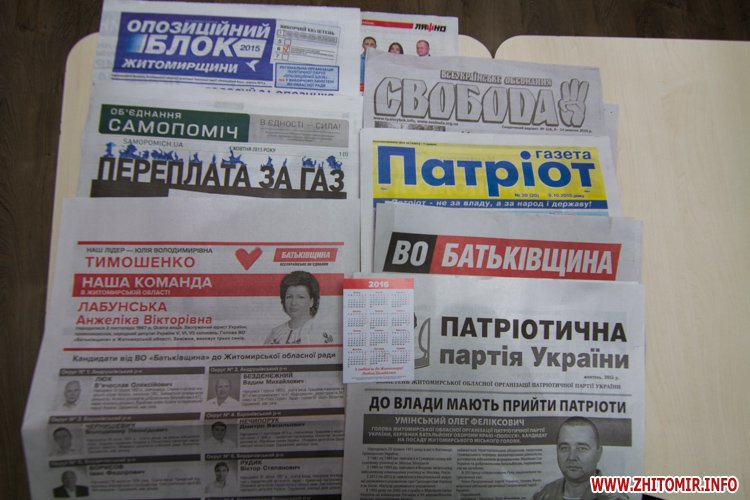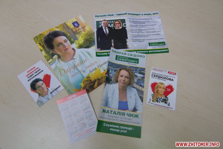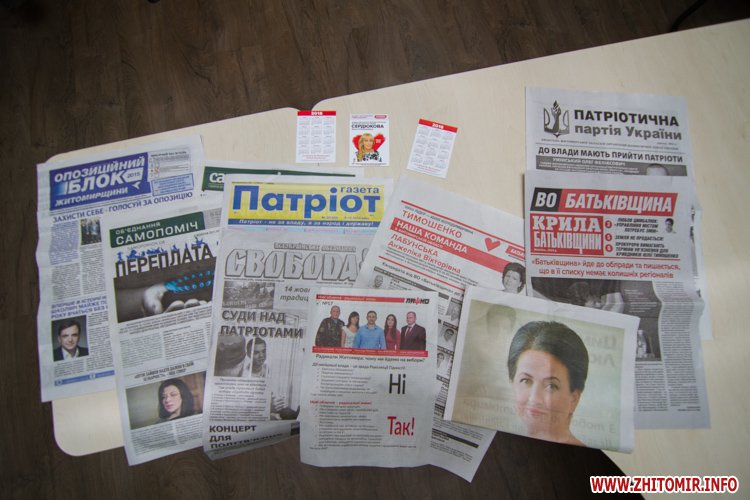Газета, которую выдают в палатках Любови Цимбалюк, имеет тираж 10 тыс. экз. Такой же тираж и у брошюры кандидата в мэры, а календариков с портретом Цимбалюк напечатали всего 1000 штук. В партийных палатках раздают газету «Крила Батьківщини» с акцентом на житомирскую команду – тираж 40 тыс. экз, информационный бюллетень со списком кандидатов от партии в облсовет – 20 тыс. экз.