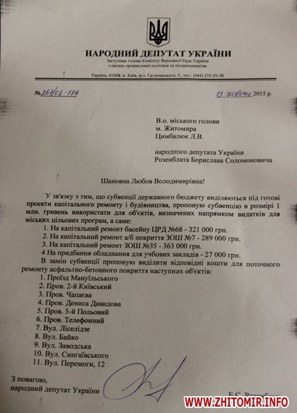 Тому він пропонує цю субвенцію використати на придбання навчального обладнання і ремонт двох шкіл та басейну, а в замін з міського бюджету виділити кошти для ремонту вулиць та провулків. Таку пропозицію нардеп висловив у листі, надісланому на ім'я секретаря Житомирської міської ради Любові Цимбалюк.