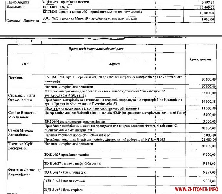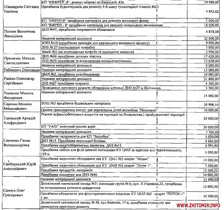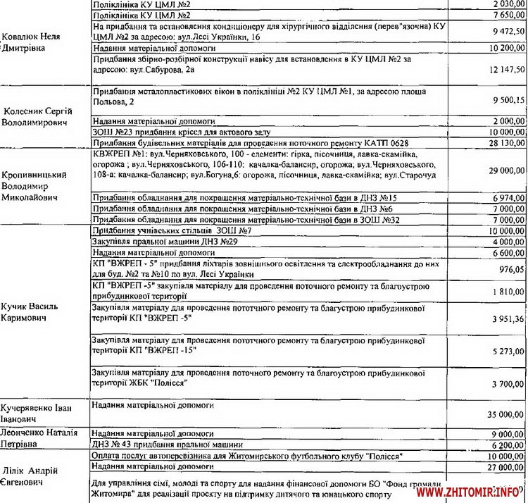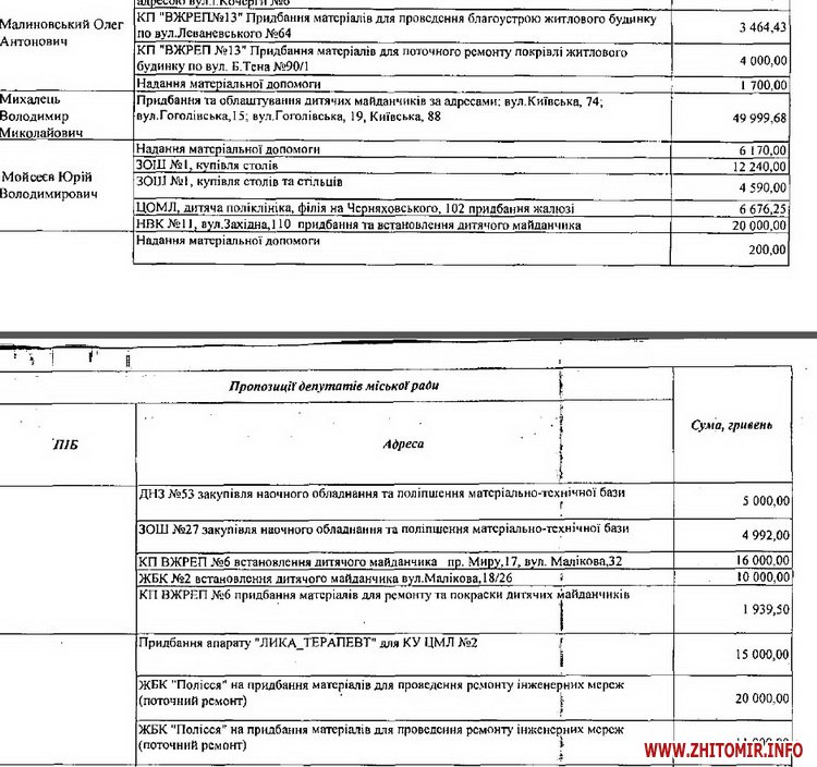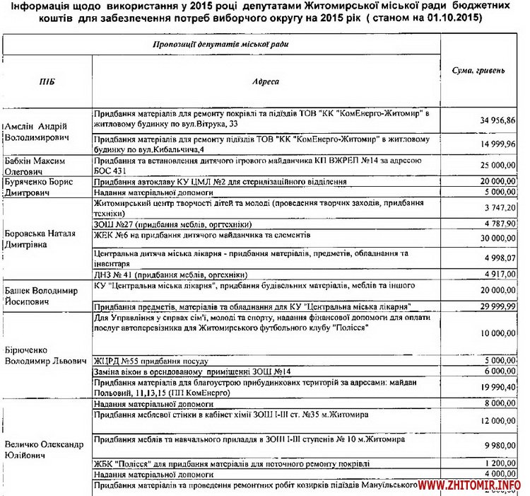 Одразу всю суму коштів витратили депутати Михайло Заславський та Юрій Ткаченко на матеріальну допомогу. Володимир Михалець на 49 999, 68 грн придбав та облаштував дитячі майданчики за адресами: вул.Київська 74 і 88 та вул. Гоголівська 15 і 19, а Василь Дехтяренко витратив 49 993, 57 грн на проведення ремонтів житлових будинків ТОВ КК «КомЕнергоЖитомир». Для ремонту будинків ТОВ КК «КомЕнергоЖитомир» виділив депутатські кошти і Андрій Амелін.