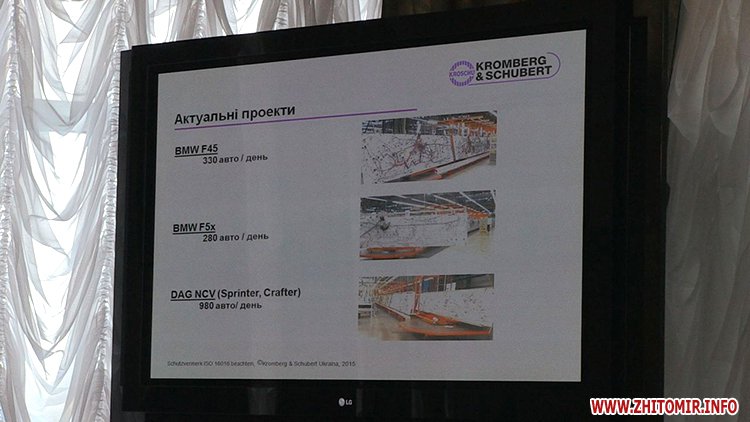 Сергій Сухомлин також додає: за цей інвестиційний проект довелося боротися з Рівним, зрештою вдалося переконати інвесторів обрати саме Житомир. Технічний директор підприємства «Кромберг енд Шуберт Україна» Славомір Качмарек розповідає: довгий час порівнювали переваги конкуруючих міст, і завдяки вигідному логістичному положенню та висококваліфікованим спеціалістам вирішили створити підприємство саме у Житомирі.