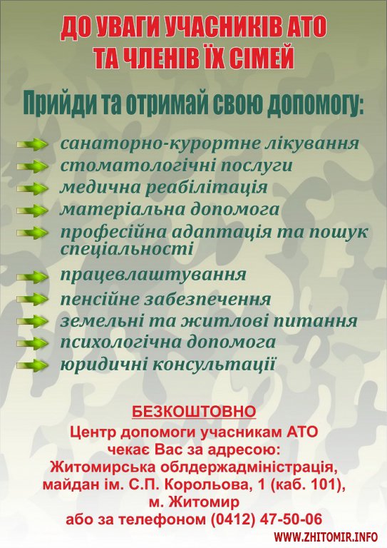 З будь-якими питаннями учасники антитерористичної операції та їх сім’ї можуть звернутися до Центру допомоги учасникам АТО при Житомирській ОДА, до місцевих та обласних управлінь соціального захисту населення й охорони здоров’я.