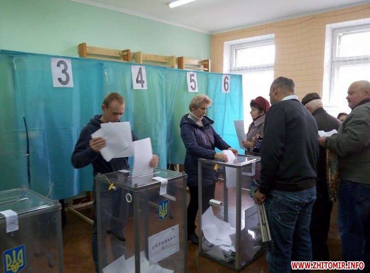 Депутат Житомирської міської ради стоїть біля скриньок, в які люди кидають бюлетені, з камерою GoPro.