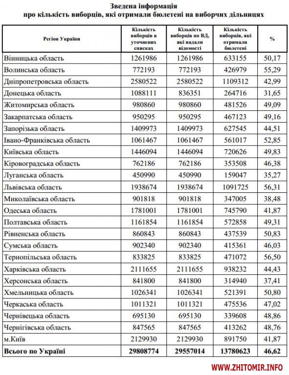 За даними ЦВК, у Житомирській області кількість виборців в уточнених списках – 980 860, кількість виборців, які отримали бюлетені – 481 526.