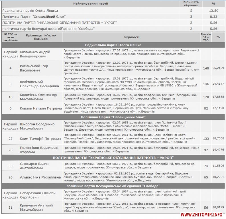 Станом на 12.00 2 листопада на сайті ЦВК є прізвища новообраних депутатів Бердичівської міської ради від чотирьох партій: Радикальна партія Олега Ляшка, УКРОП, Опозиційний блок та ВО «Свобода».