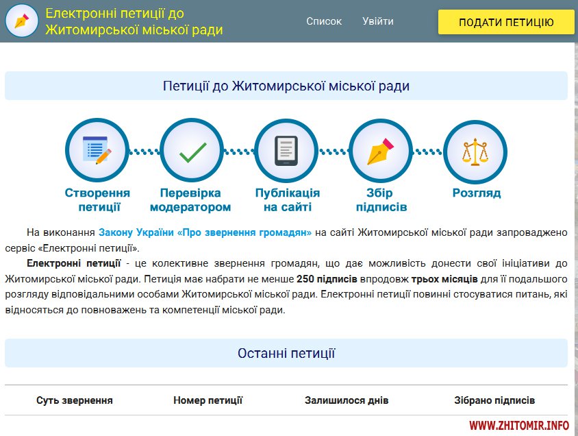 У міській раді пояснюють, що житомиряни можуть звернутися до Житомирської міської ради з електронними петиціями через сервіс «Електронні петиції», адреса – http://petitions.zt-rada.gov.ua/. В петиції має бути викладено суть звернення, зазначено прізвище, ім’я, по батькові автора (ініціатора) електронної петиції, адресу електронної пошти.